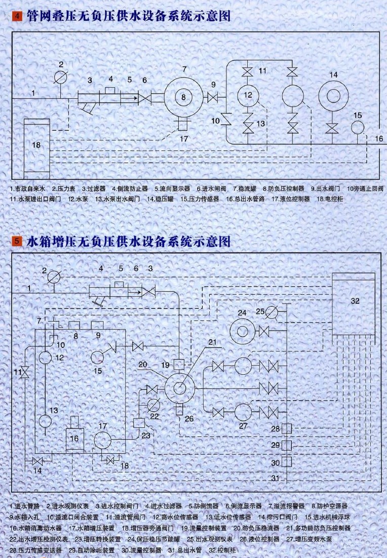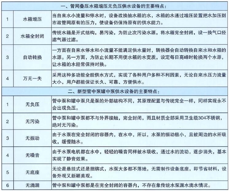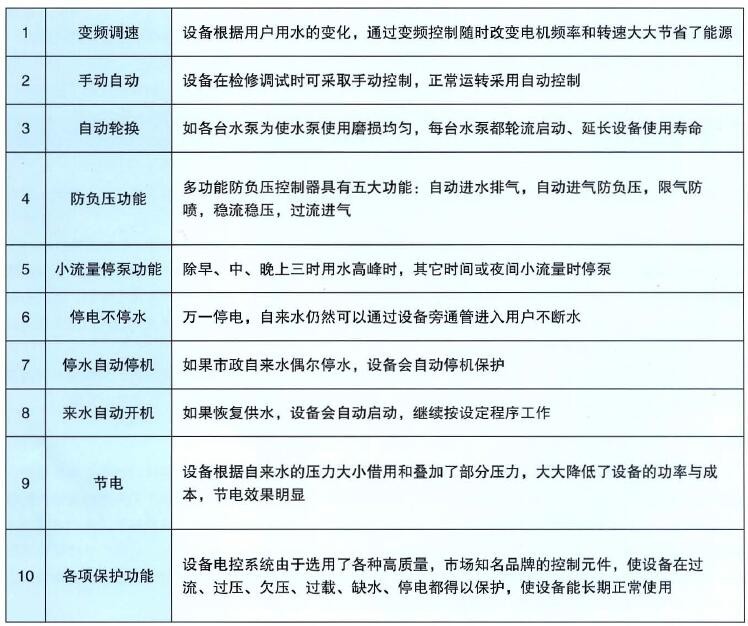 ◇ 如果自来水的压力小于用户的使用压力,水泵会自动开启,并借用了自来水的压力,对系统起到了叠加的作用,此时水泵的轴功率大大降低,加之水泵根据用户用水量的变化而变频运转或自动增减水泵的台数。