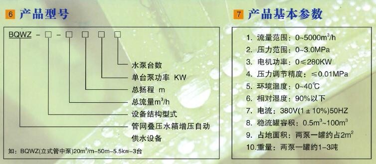 水是人类赖以生存的宝贵资源,尤其是饮用水资源更是直接与我们的生命和健康息息相关,密不可分,饮用水的安全已成为全世界共同面对的问题,我厂侬靠自身强大的科研实力通过长期不懈的努力,在饮用水供水领域已取得较大的成绩与突破,在十几年前就在全国首先推出了无负压变频自动供水设备。在此基础上又经过多年的市场调查、应用、反复研究、论证与推敲,我厂又研发出全国独一无二,最为先进、合理、科学、节能、环保的创新性产品, BQWZ型管网叠压无负压水箱增压全能变频自动供水设备,它的主要特点是吸取了管网叠压无负压、箱式无负压设备的所杳优点、功能,也同时解决以上设备中存在的所有不足与困惑,它的出现,我们坚信它可以满足全国各地在任何场合、任何条件都能安全可靠使用,而且更加节能环保。