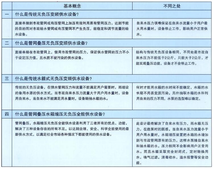 ◇ 由于坚持和依据“自来水的流量要大于等于用户每天每时用水高峰时的最大用水量”的设计原则,根据此原则,设计确定无负压罐的规格容积,所以无负阀一般情况下是不会打开的,因为用户用水是变量的,随时会形成用水时间差,而自来水一般情况下它是24小时以它原有的压力,流量不间断的向罐内注水,所以无负压阀被打开,或造成罐内无*停泵的几率是很小的。